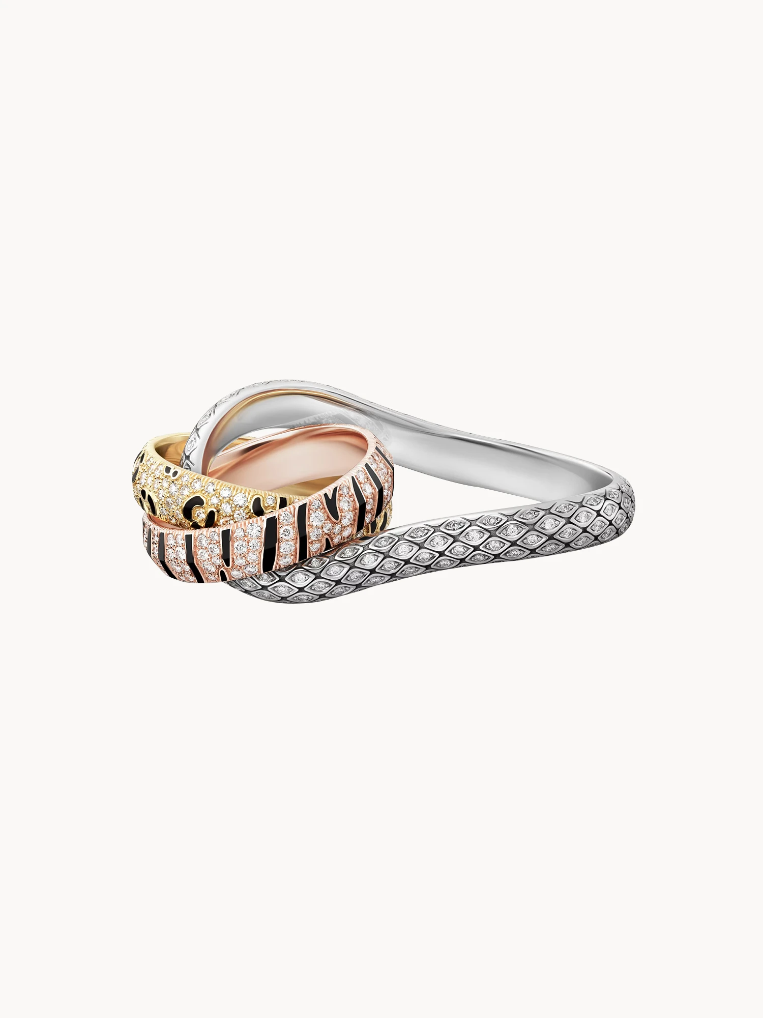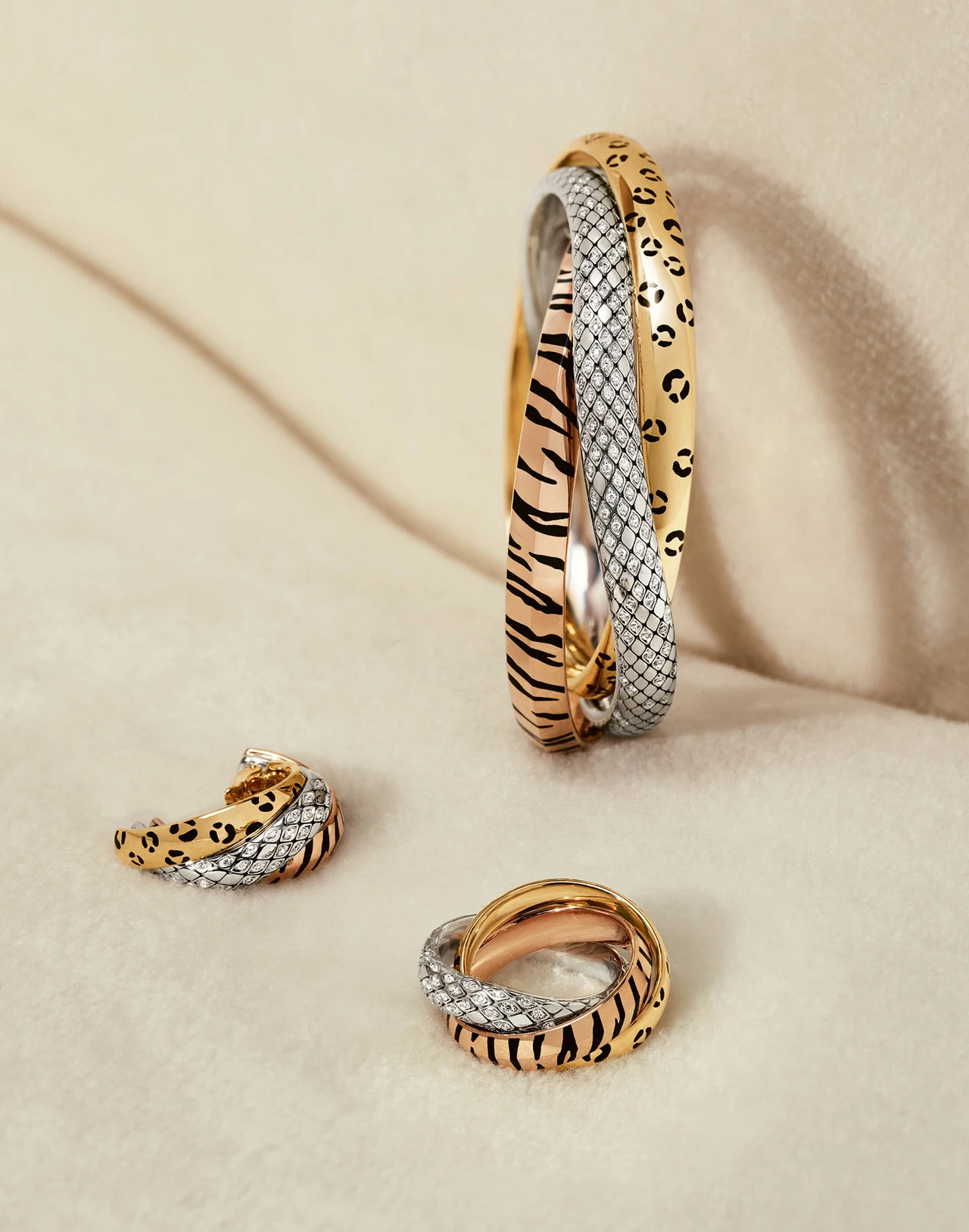 Their designs are etched onto each of the rings in this collection comprising rings, bracelets and earrings, with reptile scales on white gold, panther spots, or tiger stripes in black lacquer on yellow and rose gold. A subtle exercise in style that also relies on the shapes of the rings, each one different: the snake ring is wavy, the tiger ring is pyramidal, and the panther ring is rounded.
