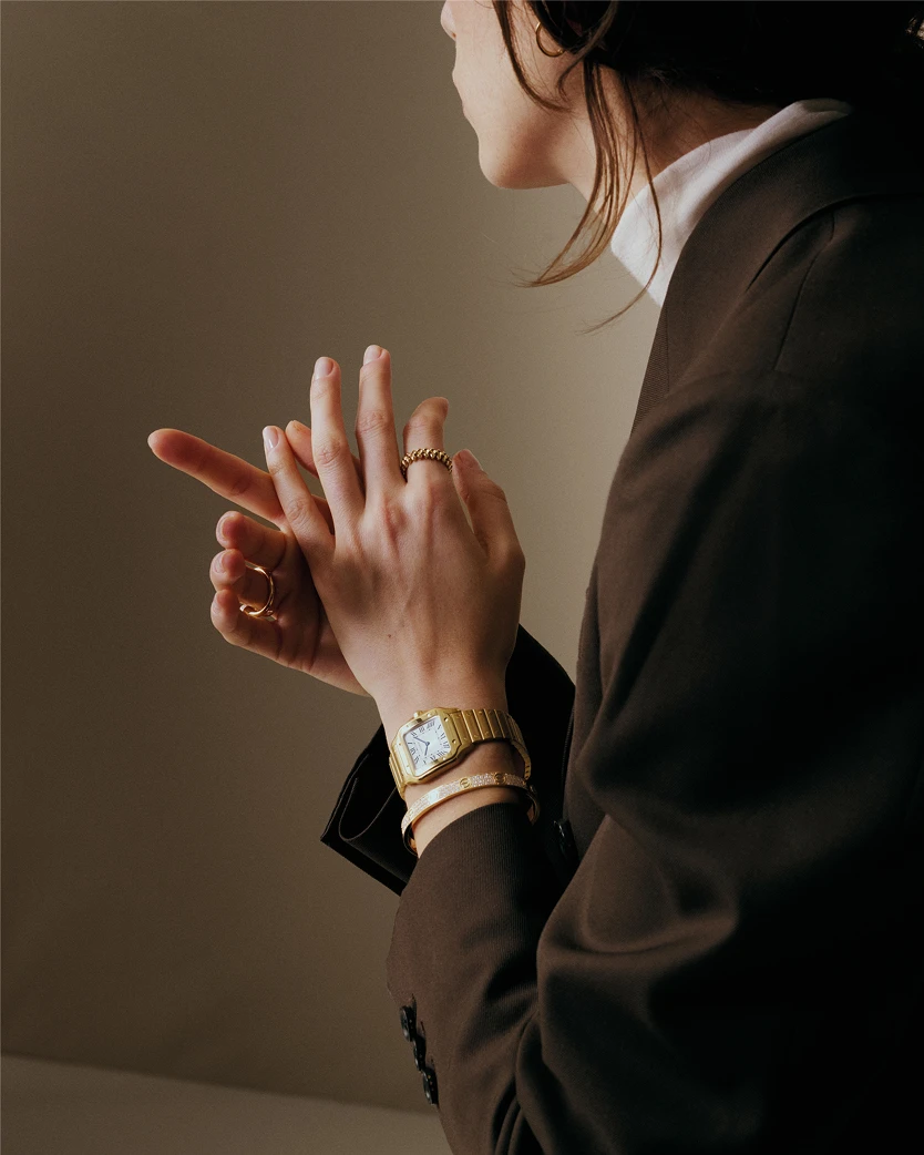 With the small version, we talk in millimeters, featuring a 27 mm x 34.5 mm diameter. It also comes in gold and steel, all-steel, or all-gold. What truly distinguishes this small Santos de Cartier watch, apart from its dimensions, is the sophistication of its sunray dial and the integration of a high-autonomy quartz movement specifically adapted to its reduced volume.