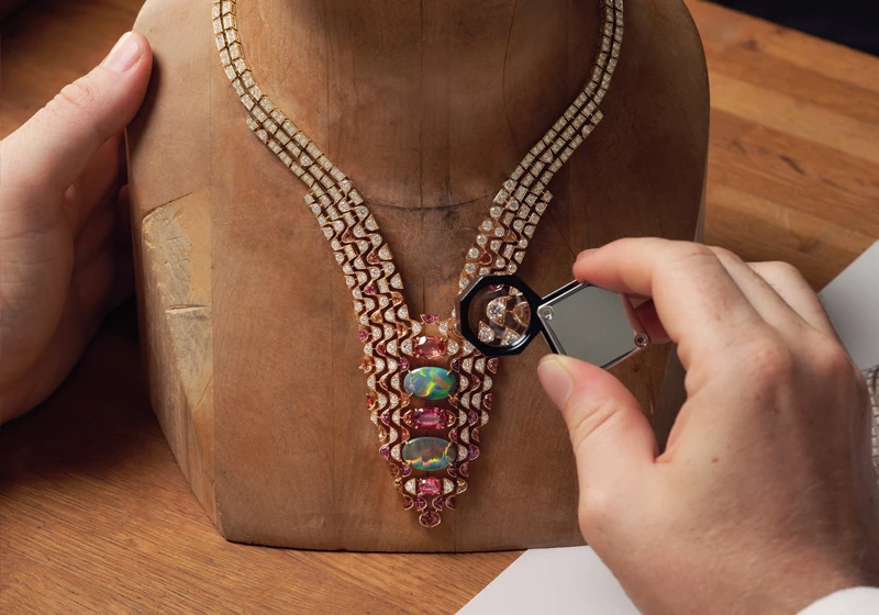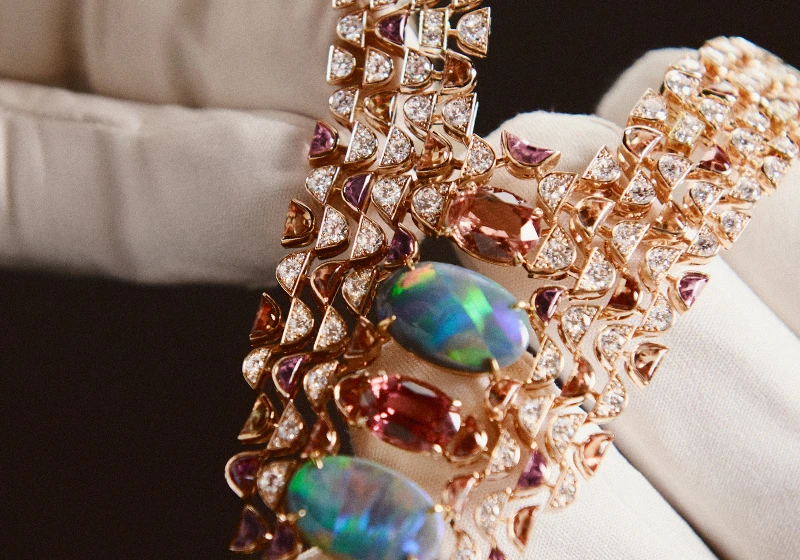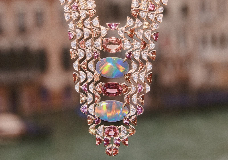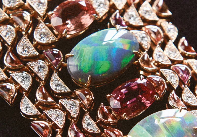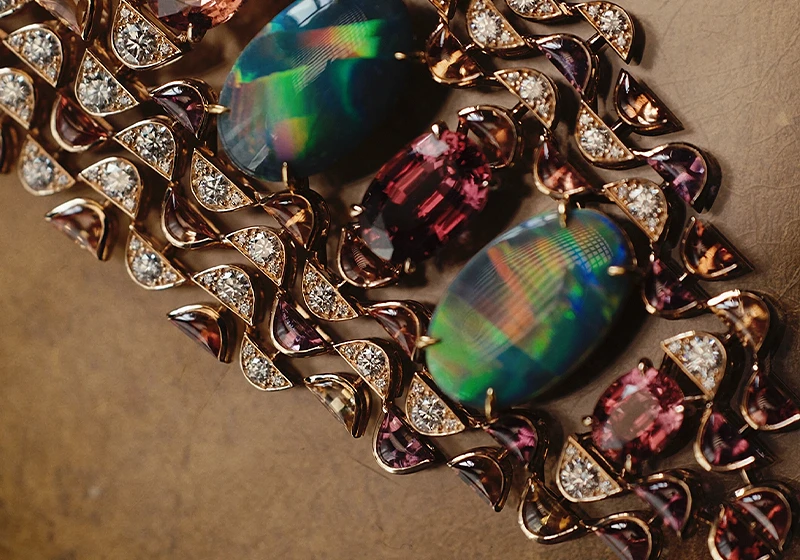 The creation explores color harmonies through a duo of spectacular opals - of 5.64 carats and 4.59 carats respectively - that radiate their multicolored iridescence throughout the composition.